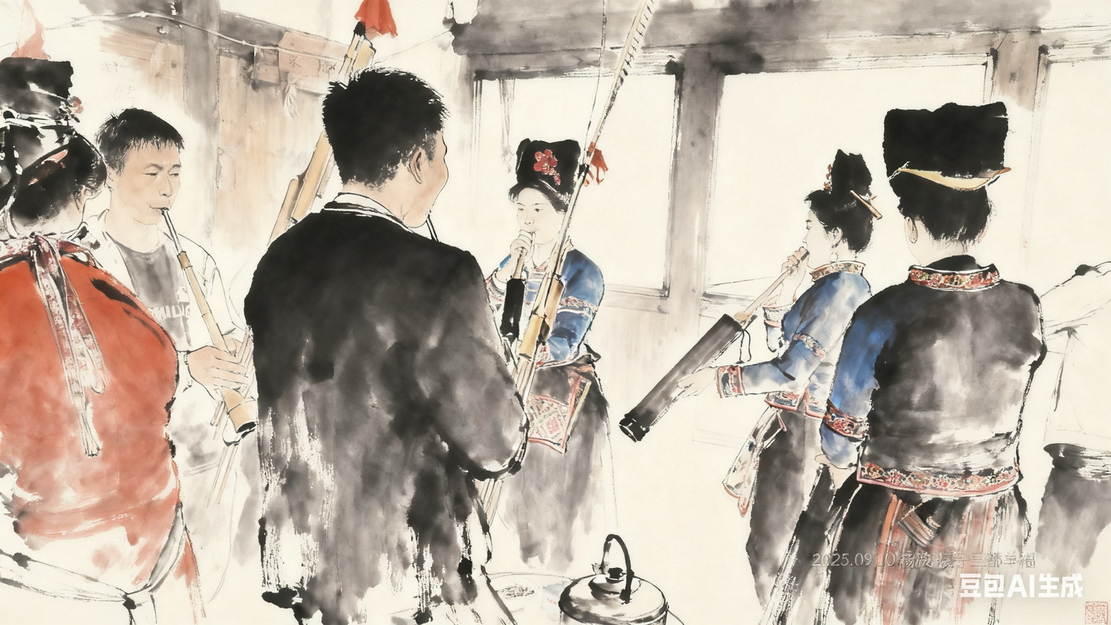 灵堂吹颂。他们来自临县丹寨的麻鸟村,属另一个支系叫短裙苗或锦鸡苗的苗族,乐队通常由女婿或关系非常紧密的合作伙伴聘请,如果是女性的葬礼,舅家也会请乐队